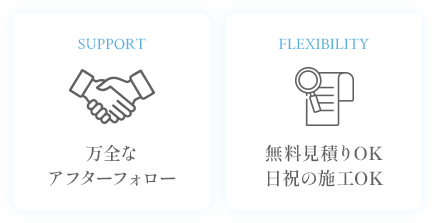 お見積り内容にご納得いただけましたら着工いたします。なお当方は日祝の施工も可能です。何かございましたら遠慮なくご相談いただくことで、柔軟な対応が可能です。